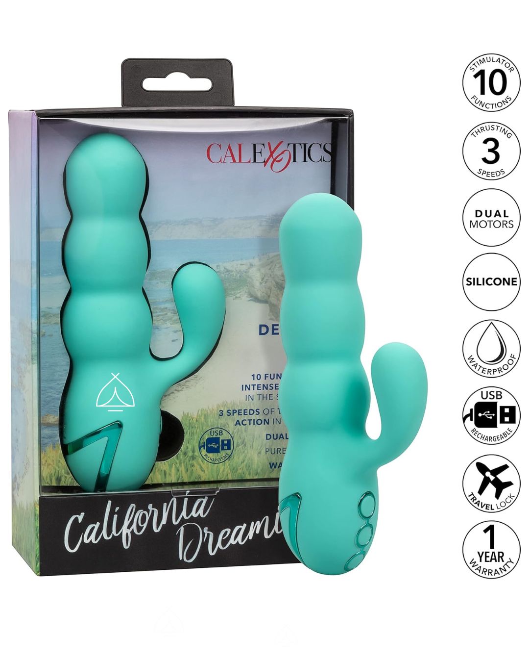 La divertida colección California Dreaming® da vida a lujosas fantasías con la atrevida Del Mar Diva. El potente masajeador está listo para revivir tus fantasías favoritas de aventuras veraniegas con 10 potentes funciones de vibración y 3 velocidades de empuje que te harán temblar las rodillas.