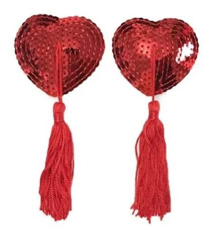 Pezoneras de corazón color rojo con lentejuelas, y motas colgantes.